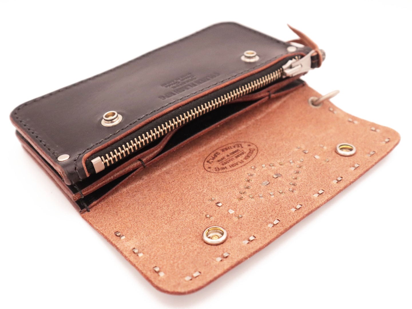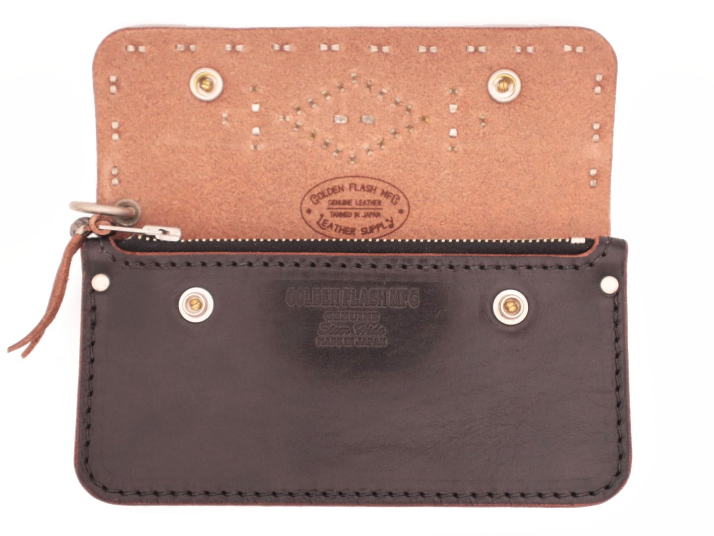 スタッズワークが存在感を放つ、GOLDEN FLASH MFG定番のトラッカーズウォレットです。